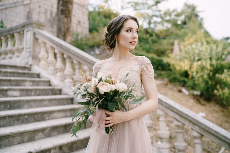 Bride with a bouquet on stone steps in the garden near the old villa